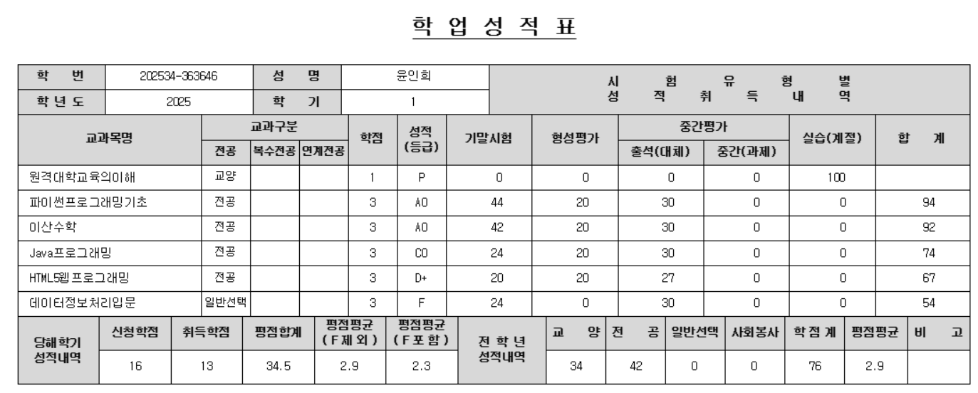 급하게 벼락치기로 그나마도 공부한 파이썬과 이산수학은 A0, 나머지는 C와 D 그리고 강의를 다 듣지못한