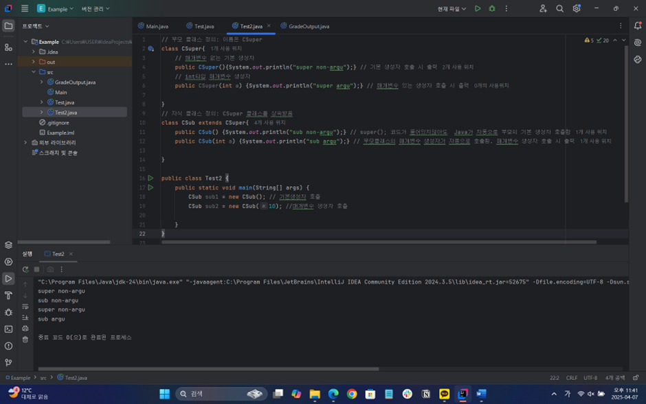 상속관계에 있는 클래스의 경우 서브클래스의 객체를 생성하면 프로그램에 별다른 코드가 들어있지 않아도 서브클래스의 생성자를 실행하기전에 슈퍼클래스의 생성자를 자동으로 호출하게 된다. 따라서 이 예제의 경우 new CSub(); 실행 시 자동으로 상속받은 슈퍼클래스의 CSuper() 가 먼저 실행되어 “super non-argu”가 먼저 출력되고 그 이후에 “sub non-argu”가 순차적으로 출력된다